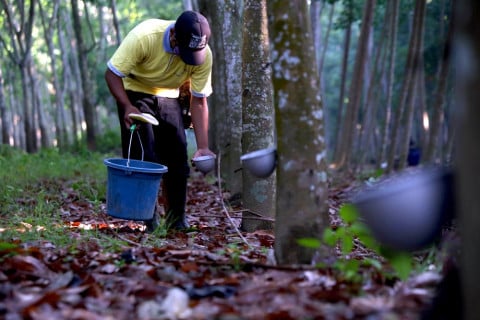 Ket foto : Ilustrasi penyadap mengumpulkan getah karet di perkebunan karet.(f/ist)